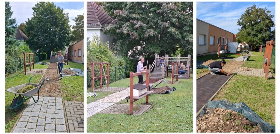 Auf dem Plan standen vor allem das Erneuern des Barfußpfades, damit dieser wieder im Rahmen der Therapie genutzt werden kann. So wurden die verschlissenen und zugewucherten Beläge abgetragen und die Strecke neu mit verschiedenen Materialien zur Fußwahrnehmung aufgefüllt. Auch wurden Sträucher zurückgeschnitten, Wege freigeschnitten, der Hublift grundgereinigt und repariert sowie mit der Aufarbeitung der Erlebnisstationen begonnen. Die Reparatur und Pflege (Schleifen, Ölen) unserer großen Holztreppe (zum Üben des Treppesteigens) fand ebenfalls statt.